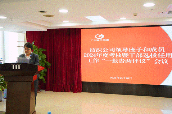 2月18日下午,紡織公司黨委召開(kāi)領(lǐng)導(dǎo)班子和成員2024年度述職暨干部選拔任用工作“一報(bào)告兩評(píng)議”會(huì)議。會(huì)議由公司黨委副書(shū)記、工會(huì)主席丘海瀾主持。紡織公司領(lǐng)導(dǎo)班子成員、中層管理干部、公司“一代表兩委員”以及黨員干部群眾代表參加了會(huì)議,廣州輕工集團(tuán)紀(jì)檢監(jiān)察室派員出席了會(huì)議。