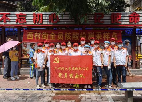 周遜姜同志(右四)帶領廣紡聯(lián)志愿者在核酸檢測現(xiàn)場